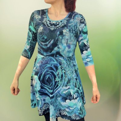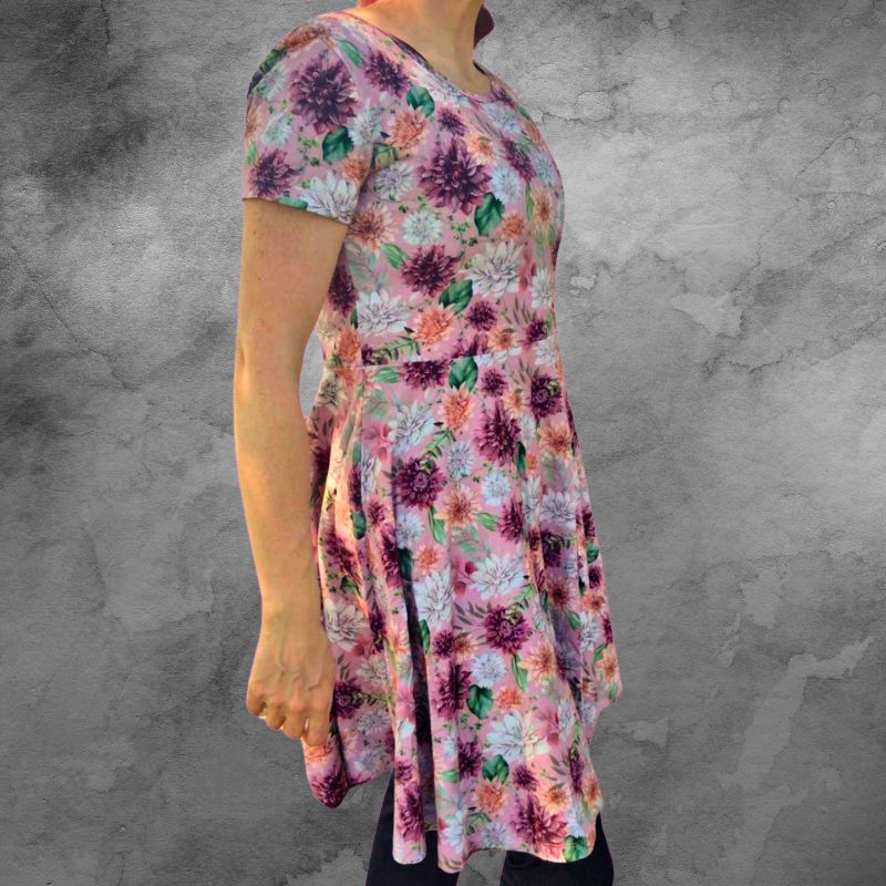 Kaunis ja linjakas, kellohelmainen mekko sopii mainiosti niin tanssilavoille, kesäjuhliin kuin työhönkin. Ihana kukkakuosi hurmaa joka paikassa ja joka säällä. Laadukas trikookangas tuntuu miellyttävältä iholla, eikä kiristä tai purista, joten käyttömukavuus on taattu. Lisäksi se säilyttää ryhtinsä käyttökerrasta toiseen. Kesän paras mekko - syystäkin!