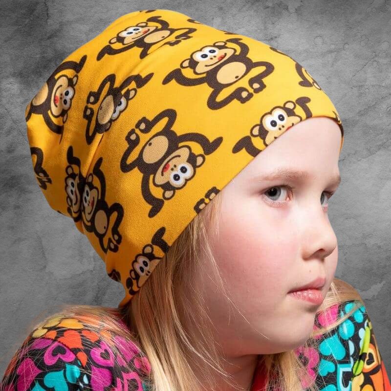 Tässä ihanan raikkaan värisessä pipossa on veikeitä apinoita - Miten valloittavan suloisia! Jokainen lapsi varmasti rakastaa värikästä pipoa, hauskalla kuosilla. Aikuisiin vetoamme hyvällä laadulla ja vastuullisella valmistuksella. Laatu on lastenvaatteissa yksi tärkeimmistä asioista, koska täytyyhän lastenvaatteiden kestää käyttöä ja pesua. Ihanat lastenvaatteet ovat mahtava piristys arkeen ja tekevät pukemisesta lapsellekin mieluisaa.
