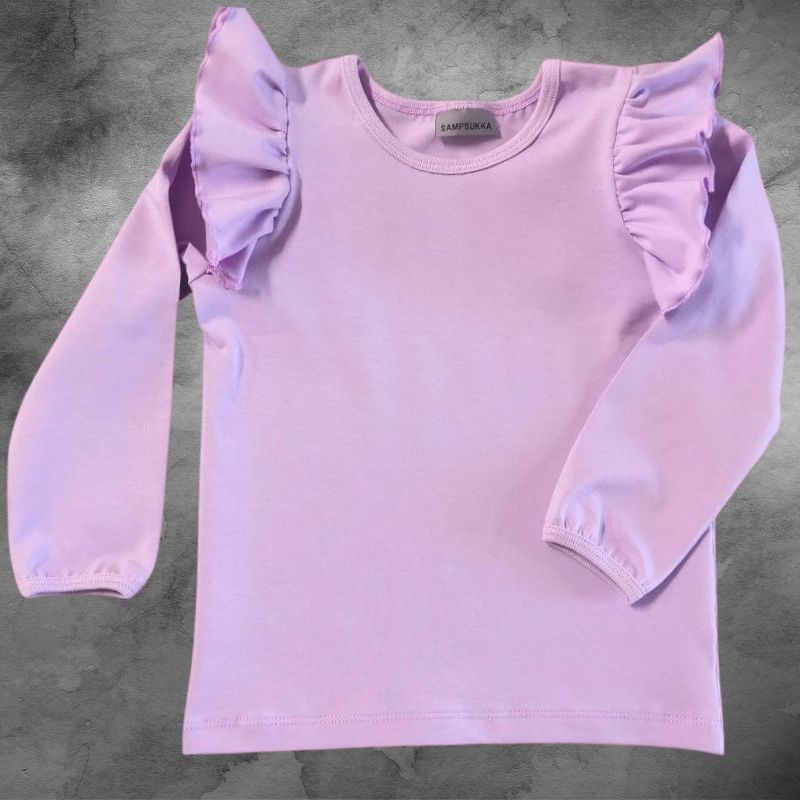 Voisiko olla söpömpää?! Ihana röyhelöpaita laadukkaista materiaaleista niin arkeen kuin juhlaankin. Pastellin sävyinen vaalea lila hurmaa kaikki ja röyhelöt tuovat ripauksen prinsessamaisuutta. Ihana luottovaate niin nuoremmille kuin vanhemmillekin lapsille. Tämä on pakko saada!