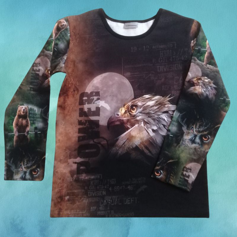 Tämä upea paita on osa meidän wild life mallistoa, jossa vaihtoehtoina on upea kotka, karhu ja pöllö. Nämä paidat ovat kerrassaan upeita! Laadukas joustocollege on mukava päällä. D-mitoitusmallisto takaa sen, että jokainen lapsi saa pukeutua lapsekkaan värikkäästi, ilman puristusta tai kiristystä.