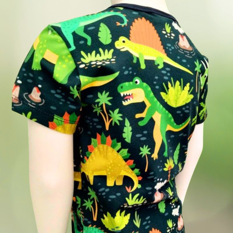 Dinot -lasten lyhythihainen on paita on valmistettu Suomessa laadukkaasta ja kestävästä luomupuuvillatrikoosta. Iloisen värikäs kuosi on lasten mieleen ja laatu vie vanhemmankin sydämen puolelleen. Laadukas trikoo on joustava ja mukava päällä.