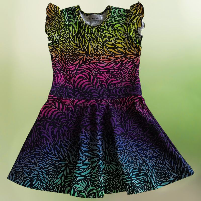 Upea liukuväri tekee tästä mekosta valloittavan. Lehtikuosi leikkii iloisesti mekon kellohelmassa ja perhoshihoissa. Tämä perhoshihamekko päällään tuntee itsensä aivan upeaksi. Siksi se sopiikin joka tilanteeseen, niin arkeen kuin juhlaan. Joustava trikoo takaa käyttömukavuuden ja laadukas kangas kestää kulutusta ja pesuja lapselta toiselle. Mekko on oikea vaatekaapin peruspilari!