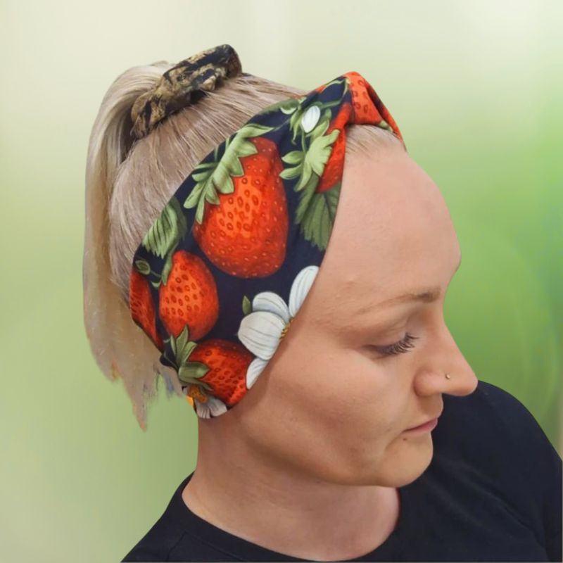 Tämä ihana mansikkakuosi on upean pirteä, mikäpäs sopisi sen paremmin kesään kuin mansikat. Laadukas trikoopanta pysyy hyvin päässä, joten voit huoletta laittaa sen päähäsi vaikka lenkille tai leikkipuistoon.  Huoletonta pukeutumista! Solmu tuo pantaan hauskan twistin.
