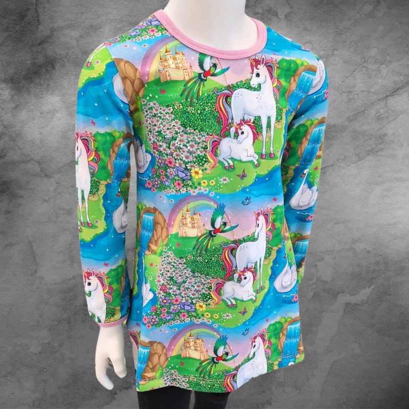 Rakastatko yksisarvisia? Tästä tunikasta taitaa tulla sinun lempivaatteesi. Mielikuvitus pääsee aivan uusille ulottuvuuksille tämän valloittavan kuosin siivittämänä. Voisiko tämän upeampaa tunikaa ollakaan! Joustava trikoo takaa käyttömukavuuden ja laadukas kangas kestää kulutusta ja pesuja. Leggingsit vielä jalkaan, niin leikit voivat alkaa!